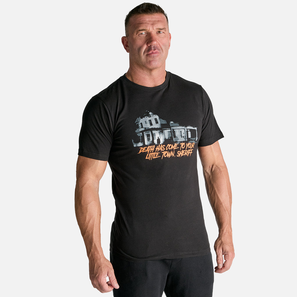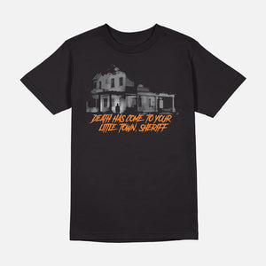 This officially licensed Halloween tee captures the chilling heart of Haddonfield. Featuring the ominous silhouette of Michael Myers’ childhood home with the haunting quote “Death has come to your little town, Sheriff,” this design brings one of the film’s most iconic lines to life. Dark, eerie, and unforgettable — it’s a wearable reminder that terror always finds its way back home. Wear this one-of-a-kind graphic to channel the dread that made Halloween a horror classic.
